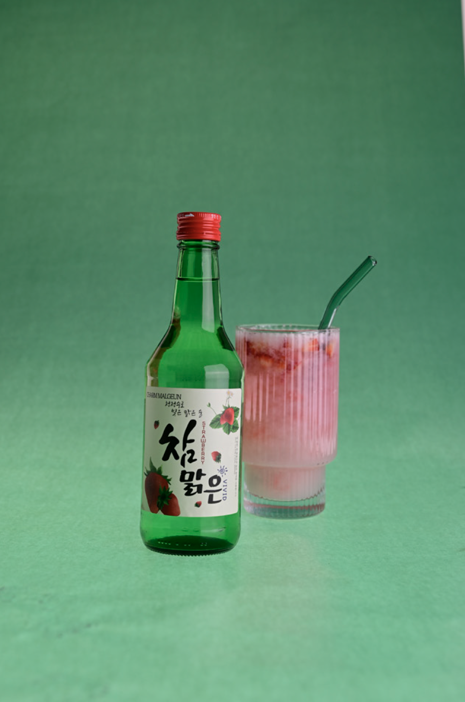 A variety of different angles of the soju bottle, as well as carefully arranged lighting on the strawberries and the cup, were thoughtfully experimented with to achieve the best possible composition. Different camera angles were carefully adjusted to lower positions in order to create natural blurs at the base of the bottle, effectively minimising any distractions in the background. Additionally, highlighters were strategically used to emphasise the matte texture of the bottle, enhancing its tactile quality. These combined techniques resulted in a visually appealing and polished final image that draws the viewer’s attention to the product’s key features.
